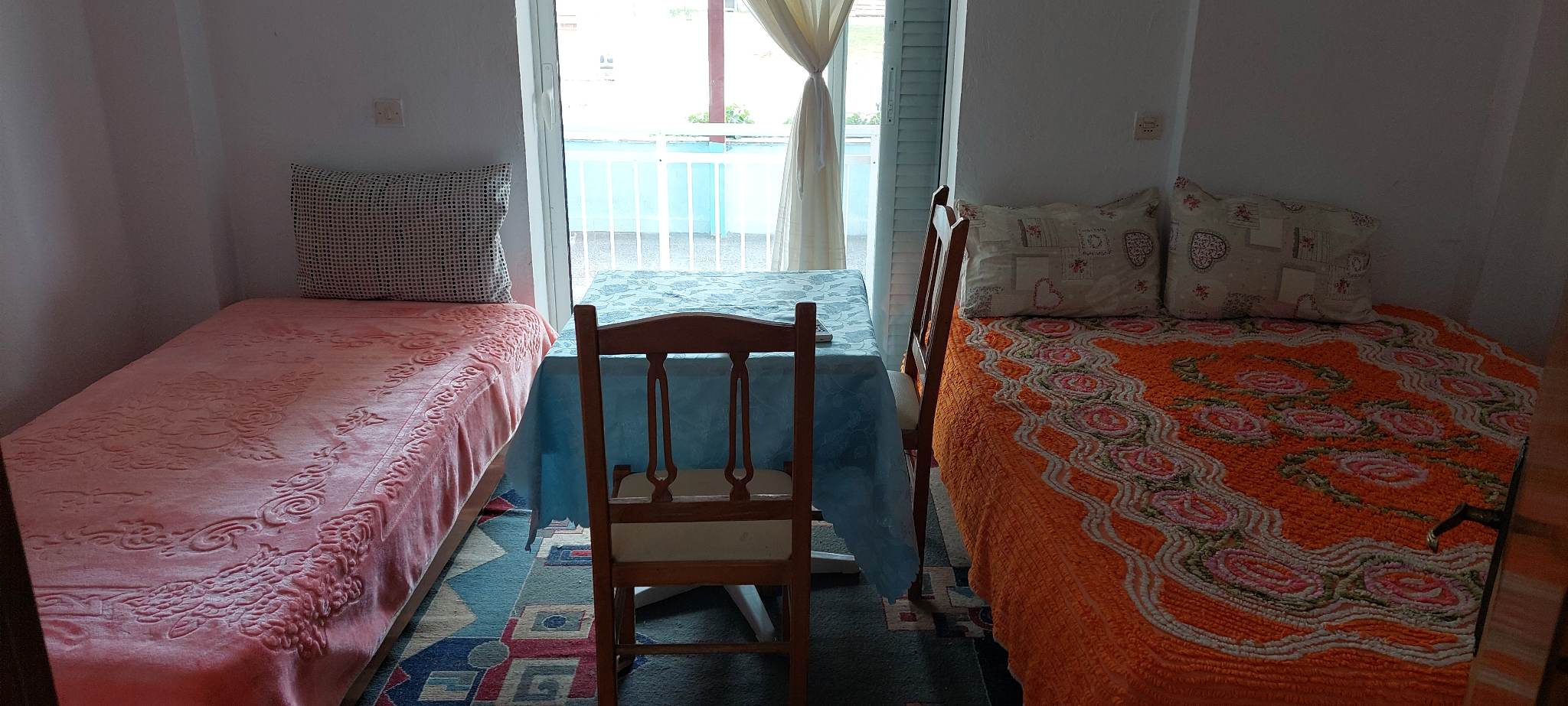 - 1/4 СТУДИО БР.8 - Се наоѓа на првиот кат во вилата, има сопствена тераса која гледа во соседната куќа (ѕид), WC. Располага со еден дупли и 2 единечни кревети и во истата просторија се наоѓа и кујната опремена со решо и голем фрижидер.