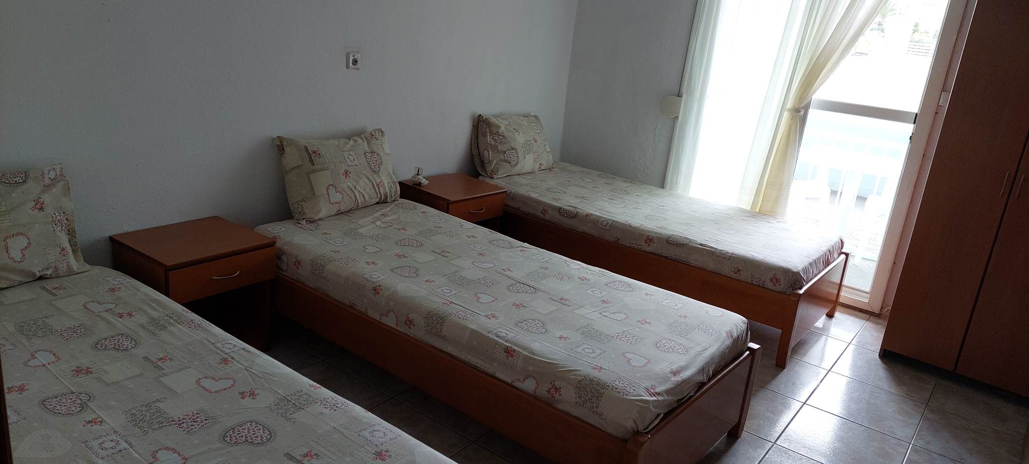 - 1/3 СТУДИО БР.5 - Се наоѓа на првиот кат во вилата, има сопствена тераса и WC. Студиото располага со 3 единечни кревети и во истата просторија се наоѓа и кујната опремена со решо и голем фрижидер.