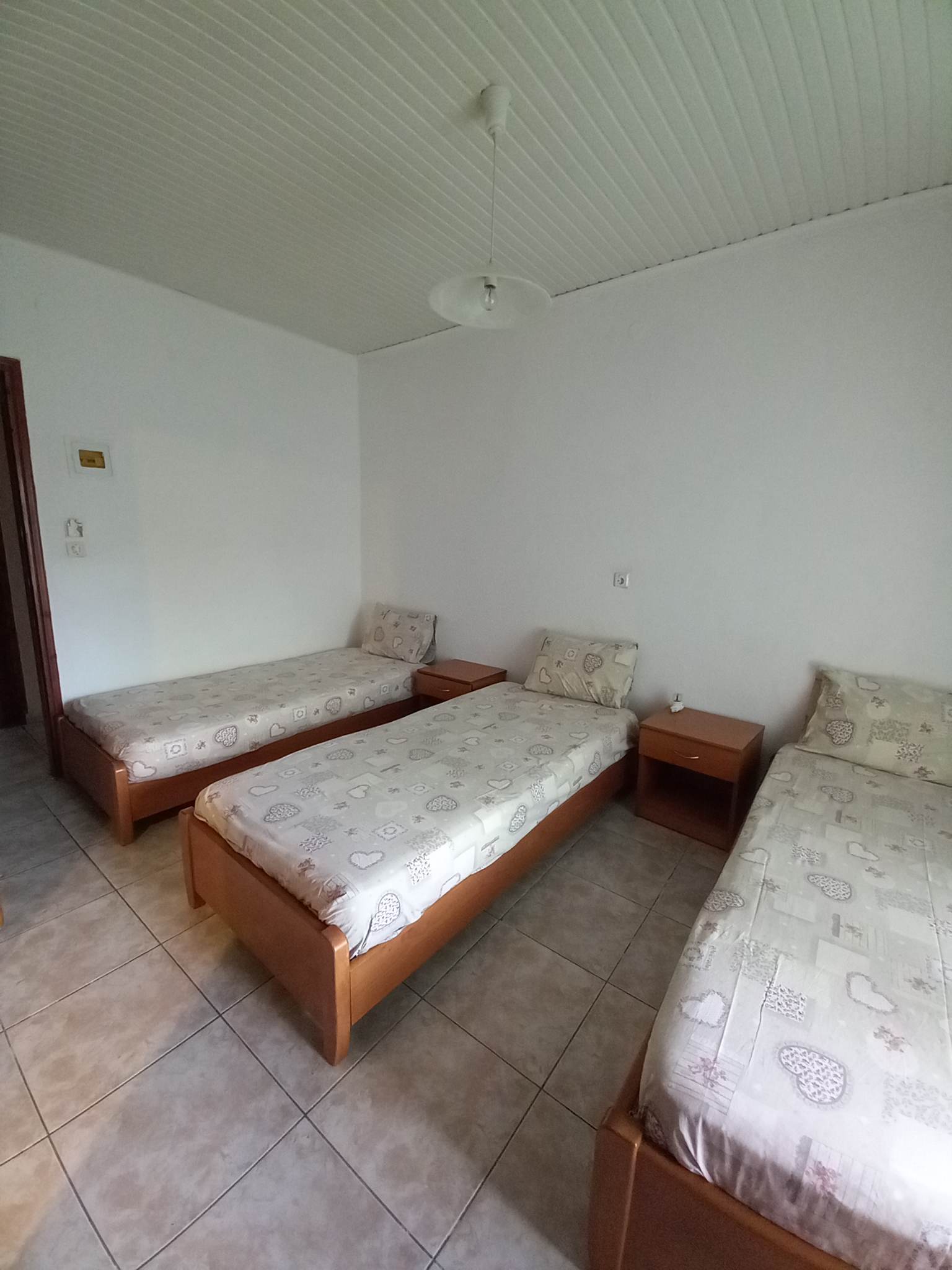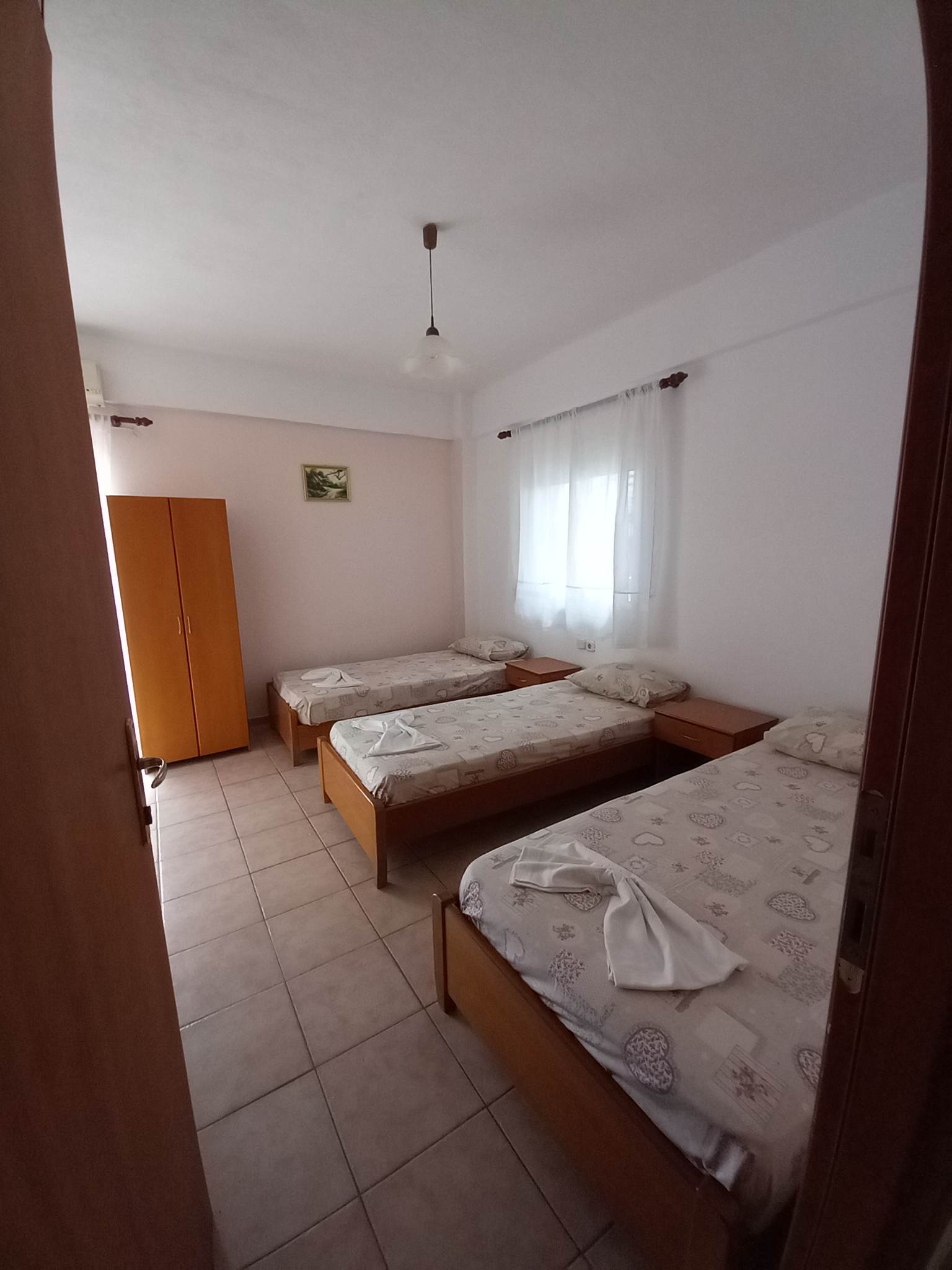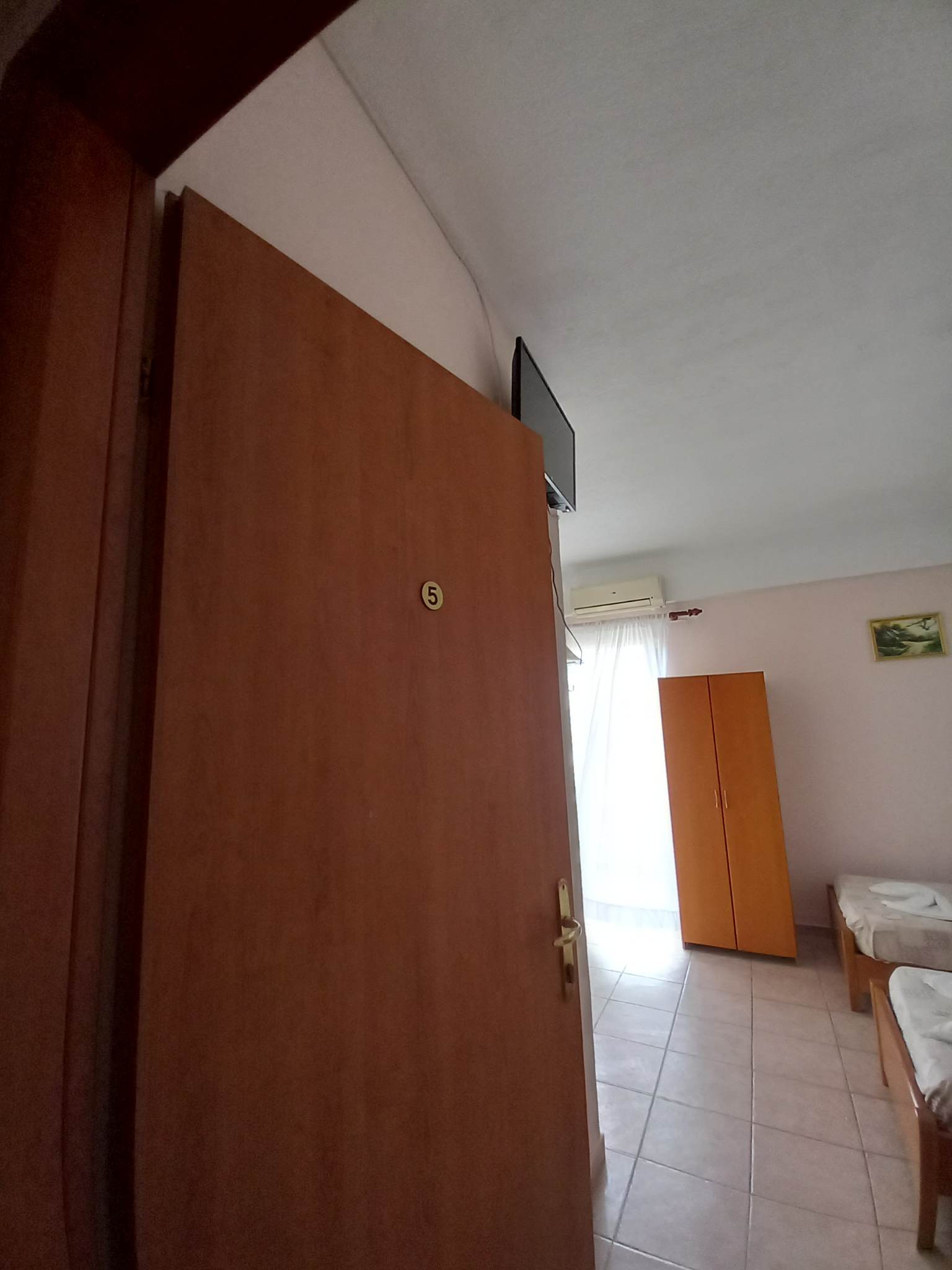- 1/5 ДУПЛЕКС БР.7 - Се наоѓа на првиот кат од вилата има долга тераса на која се излегува од двете спални и од кујната. Кујната се наоѓа во ходникот на дуплексот помеѓу двете спални соби и е оремена со решо и голем фрижидер . Дуплексот има сопствено WC. Во едната спална има 1 дупли и 1 единечен кревет, а во другата спална соба има 2 единечни кревети и ТВ. Во дуплексот има 2 клими по една во секоја спална соба .