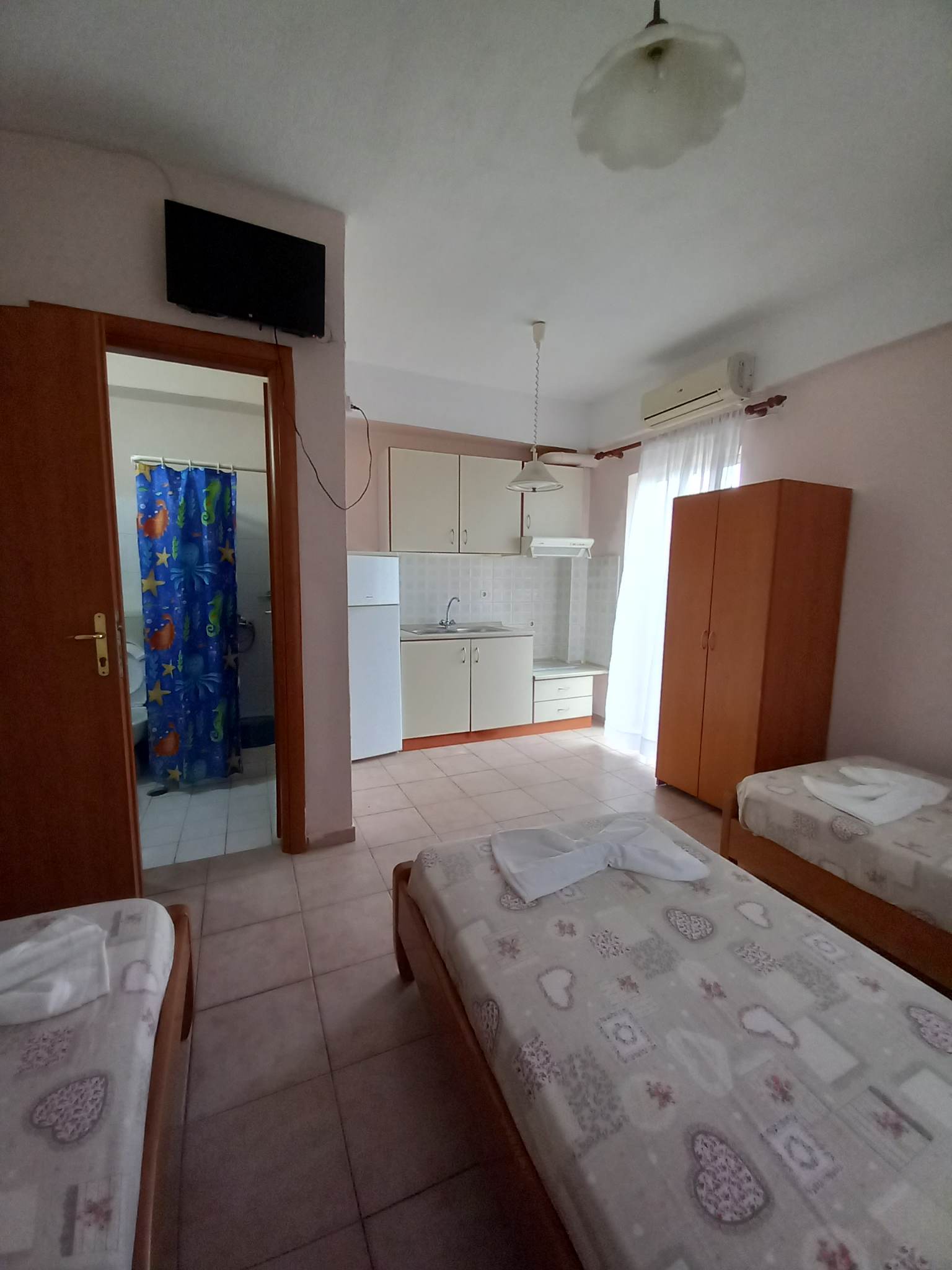 - 1/4 СТУДИО БР.3 - Се наоѓа на приземје, има заграден дел од дворот кој се користи како тераса и е од левата страна при влез во самата вила. Кујната е одделена од собата со врата и е опремена со решо и мал фрижидер. Студиото располага со еден дупли и два единечни кревети. Од собата се излегува на терасата. Има сопствено WC.