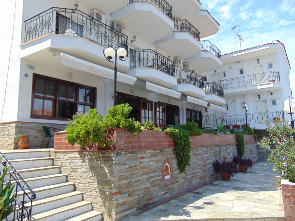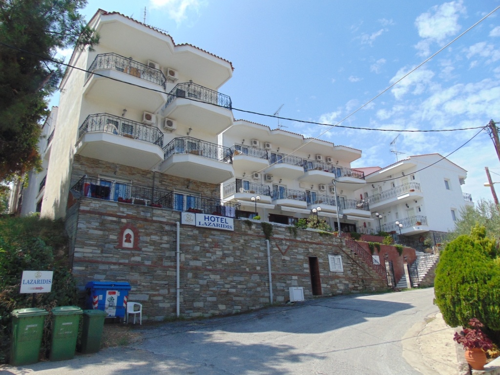 На околу 150 метри од плажата, во мирниот дел на Неа Рода на третиот крак Атос се наоѓа хотелот од апартмански тип „Lazaridis“ во кој располагаме со трокреветни студија (со фотелја на расклопување) на високо приземје и прв спрат. Сите сместувачки капацитети се опремени со мебел соодветен на хотелско сместување, мини кујна, телевизор и клима уред чие користење е вклучено во цената. Не е дозволено да го оставате вклучен клима уредот доколку не сте во апартманот.Во спротивно сопственикот на вилата има право да го исклучи.Студијата имаат сопствени купатила и пространи тераси со поглед на море. Сите сместувачки капацитети се опремени со постелнина и крпи кои се менуваат еднаш во текот на десет дена. Затоплувањето на водата во целата вила е со бојлери, а вилата е покриена со безжичен интернет. Агенцијата како организатор на патувањето не може да биде одговорна за квалитетот на интернет конекцијата. Во непосредна близина на вилата има простор за паркирање на возила. Апартхотелот „Lazaridis“има рецепција, сеф, снек бар, прекрасна тераса која можат да ја користат сите гости на хотелот, а во хотелот има можност за појадок (со доплата на рецепција). До центарот на ова живописното приморско место имате десетина минути бавно пешачење, а доколку се одлучите да ги обиколите околните плажи, тогаш изборот задолжително нека биде на атрактивната плажа „Voulitsa“ која уштена првата средба ќе Ве остави без здив (се наоѓа во непосредна близина на хотелот). На 4,5 км. од хотелот пак се наоѓа фантастичната песочна плажа „Komitsa“, која токму заради својата раскошна убавина е на листата на светските културни богатства и е под заштита на УНЕСКО како подрачје со природна убавина.