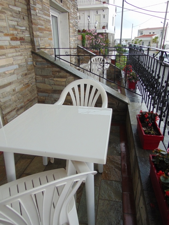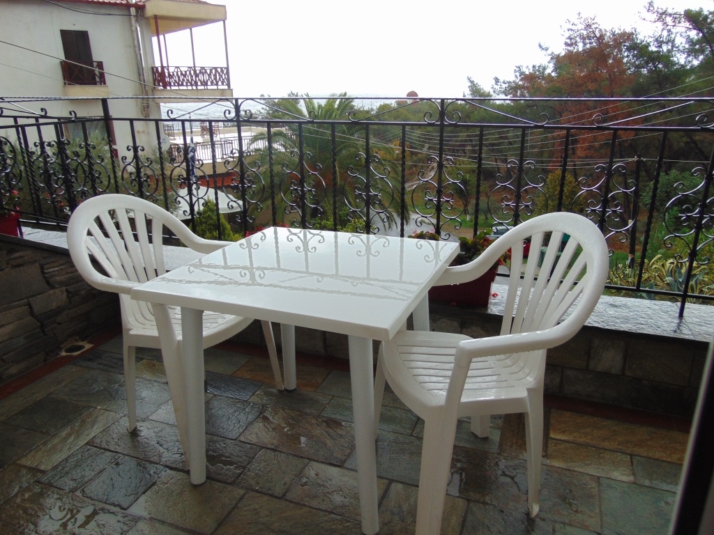 Двокреветно студио на прв спрат кое има еден дупли кревет и еден помошен кревет со нормални димензии (во ценовникот студиото е назначено како 1/2+1) Опремено е со мебел, телевизор, клима уред. Во истата просторија се сместени елементите од кујната (електрично решо со две рингли, аспиратор, фрижидер со мала комора, основни садови за готвење и јадење). Студиото има купатило со сопствен бојлер. Терасата е со нормална големина, опремена е со пластична маса и столчиња и има поглед на море и прекрасно природно опкружување. Напомена: Приземјето е на исто ниво со терасата на хотелот.