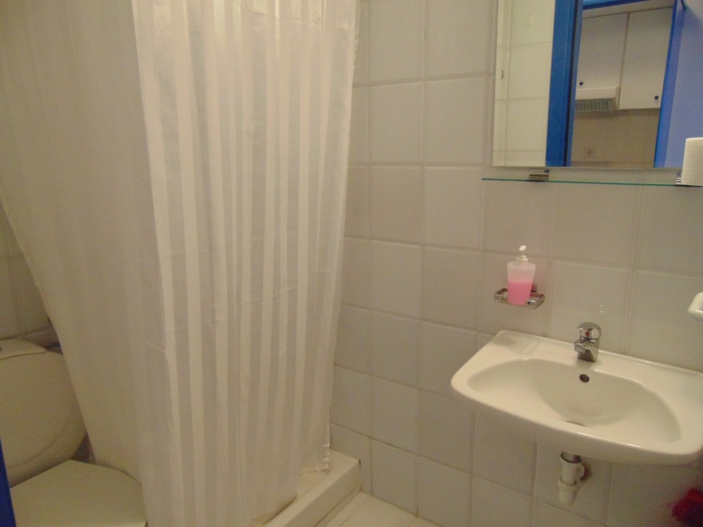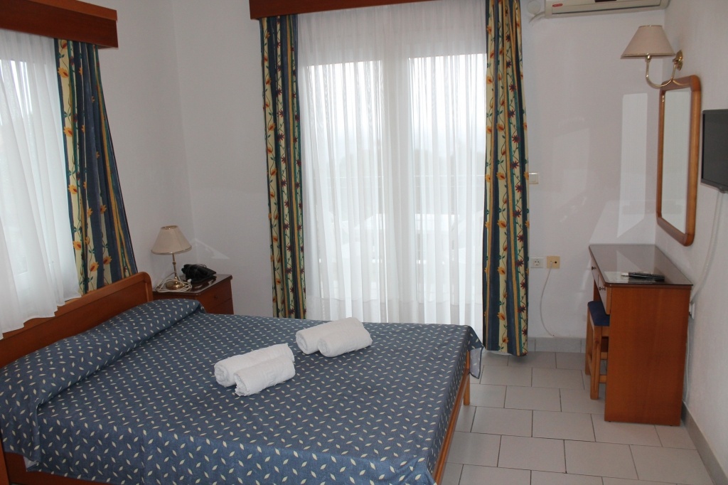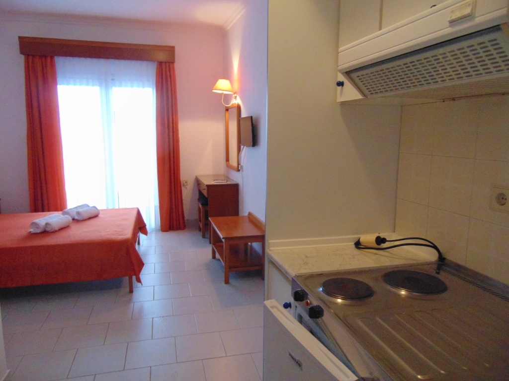 Двокреветно студио на високо приземје кое има еден дупли кревет и еден помошен кревет со нормални димензии (во ценовникот студиото е назначено како 1/2+1) Опремено е со мебел, телевизор, клима уред. Во истата просторија се сместени елементите од кујната (електрично решо со две рингли, аспиратор, фрижидер со мала комора, основни садови за готвење и јадење). Студиото има купатило со сопствен бојлер.Терасата е со нормална големина, опремена е со пластична маса и столчиња и има поглед на море. Напомена: Приземјето е на исто ниво со терасата на хотелот.