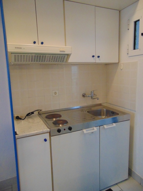 Двокреветно студио на прв спрат кое има еден дупли кревет, мебел, телевизор, клима уред. Во истата просторија се сместени елементите од кујната (електрично решо со две рингли, аспиратор, фрижидер со мала комора, основни садови за готвење и јадење). Студиото има купатило со сопствен бојлер. Терасата е со нормална големина, опремена е со пластична маса и столчиња и има поглед на море.