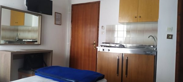 Студиото располага со еден дупол кревет стандарден за спиење за две лица и еден поединечен кревет стандарден за спиење за едно лице,плакар за алишта, тв, клима уред. Во склопот на истата соба има кујна комплетно опремена со кујнски инвентар,фрижидер ,решо со две рингли.Од собата се излегува на комотна тераса со маса и столици и има поглед на море.Студиото располага со стандардно купатило и вц.
